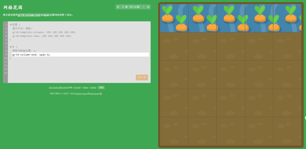grid-column-start把水引到第3列”,你就得在代码区里动手。代码一写对,水就“哗啦”一下流到胡萝卜旁边,那种即时反馈的爽感,真的比看十遍文档都管用。28关,从零到精通
